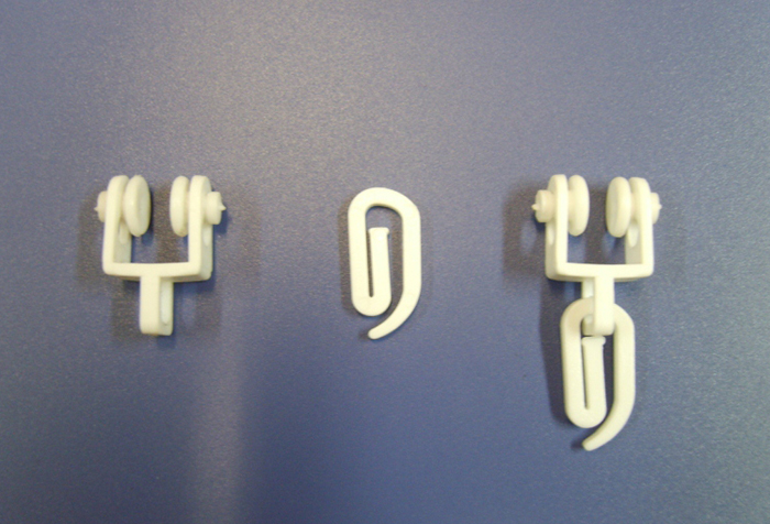 - Крючки. Они очень функциональны и удобны. Верхнюю часть крючка вдевают в направляющие, а на нижние цепляют сами полотна за петли. Крючки прочные и выдерживают даже плотные ткани.