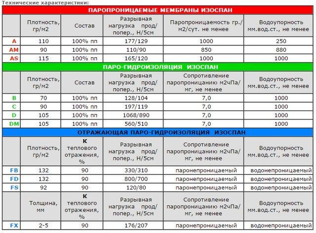 В качестве примера приведены технические данные, относящиеся к пароизоляции марки «Изоспан»: