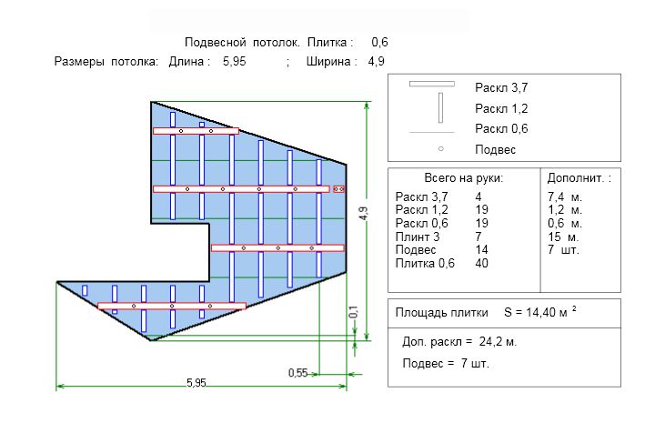 Основные направляющие располагаются с шагом в 1 м 20 см друг от друга и от края стены, подвешиваются вдоль самой протяженной стены тремя подвесами. Количество плит легче вычислить, начертив чертеж потолочной площади. Идеальным вариантом является ее закрытие максимальным количеством целых пластин. Нужно стараться, чтобы резаные плиты попадали на наименее заметные места. С помощью чертежа будет видно, что целых панелей понадобится 28 шт., что составит 10,08 кв.м. Остальные будут с подрезкой 8 шт. Следует учесть, что ширина пристенных кассет должна составлять не менее 300 мм. Итого вам понадобится 36 шт.