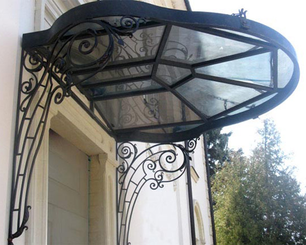 Представлен в разных вариациях и обеспечивает надежную защиту парадной двери от неблагоприятных погодных условий. Для изготовления навесов можно использовать металлический уголок, швеллер, трубу. Очень эффектно смотрятся козырьки, конструкция которых имеет декоративное оформление коваными элементами.