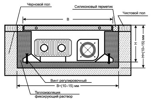 - После подключения всех элементов конвектора пол вокруг него заливается стяжкой по стандартной технологии.