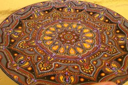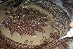 При помощи точечной техники вы сможете декорировать как новый, так и старый столик. Первым делом нужно подобрать орнамент. Это может быть африканский мотив, пущенный по кромке стола, или ажурная кружевная салфетка, расположенная по центру. Все зависит только от вашей фантазии и задумки. Цвета контура подбирают в соответствии с выбранным узором. Для украшения стола в африканском стиле подойдут такие цвета, как красный, желтый, коричневый и черный. Кружевные мотивы нуждаются в более легкой цветовой гамме, желательно использовать белый, серебристый, серый и голубой оттенки. Для имитации бисерной вышивки, помимо обычных контуров, можно использовать специальный — с жемчужным эффектом.