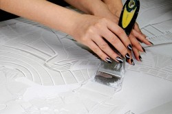 Трафарет нужно приклеить на поверхность скотчем, чтобы случайно не сдвинуть его во время работы.