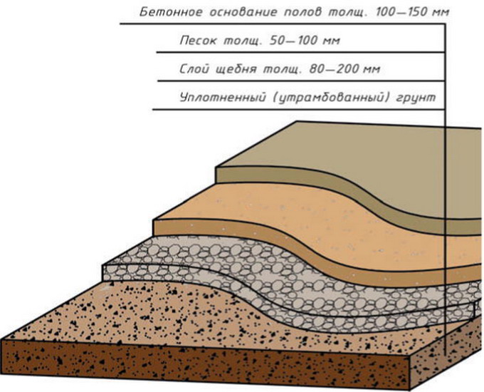 Бетонный пол укладывают двумя способами: на лагах и на грунт. Вариант укладки на лаги, мы уже рассмотрели. Теперь определимся с особенностями укладки на грунт.