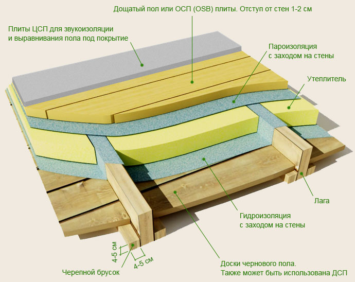 Самый простой способ укладки пола – монтаж на черепные брусочки, с последующим настилом утеплителя, материала для гидроизоляции и пароизоляции.