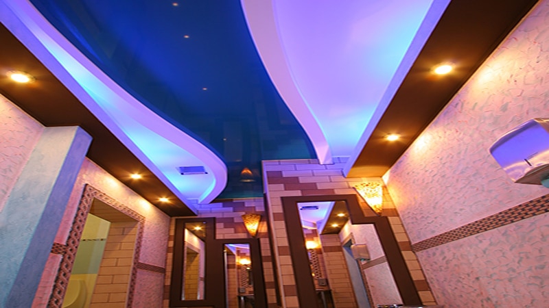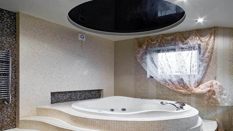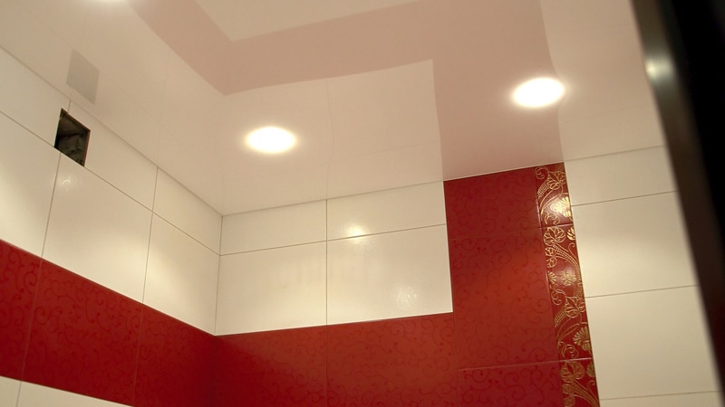 Понятно, что ванна должна не только оснащаться необходимыми электроприборами, но и быть достаточно красивой. Ассортимент потолков настолько широк, что из любого помещения можно сделать «песню». Он может быть глянцевым, матовым, иметь оттенок металлик и пр. Что касается цветов, ограничений здесь нет: есть классические белые и черные, есть нежная пастель и яркие кислотные.