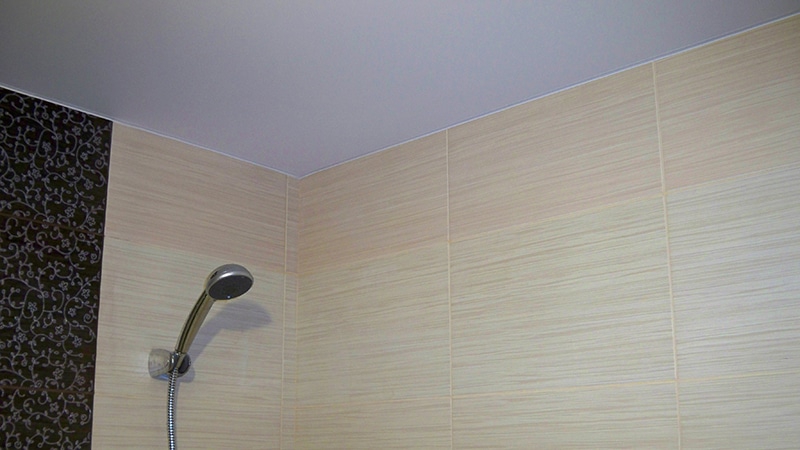 Натяжной потолок в ванной комнате лучше заказывать не глянцевый, а матовый, т.к. во время приема душа могут образовываться капельки от пара на потолке, которые при высыхании могут быть заметны. На матовом потолке таких проблем нет.