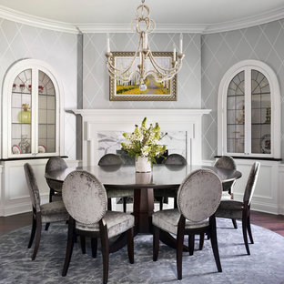На фото: столовые в классическом стиле с серыми стенами, темным паркетным полом, фасадом камина из камня и стандартным камином