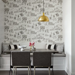 На фото: столовая среднего размера в стиле современная классика с разноцветными стенами, темным паркетным полом и коричневым полом с