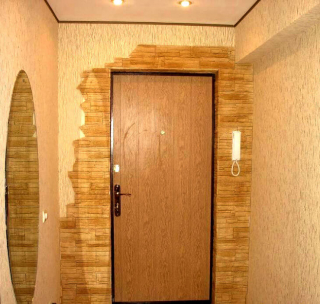 Внутренняя сторона оббивается стеновыми панелями, что позволяет подобрать материал под любой интерьер квартиры или дома. МДФ может имитировать текстуру дорогой древесины. Единственный недостаток – требует бережной эксплуатации. Пластиковые панели более просты и дешевы, но практичнее.
