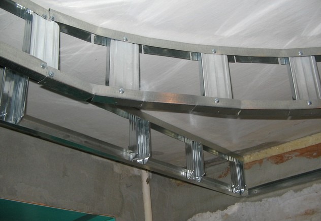 - Гипсокартон. Конструкция не будет нести значимой нагрузки, поэтому вполне достаточно использовать потолочный ГКЛ толщиной 9 мм.