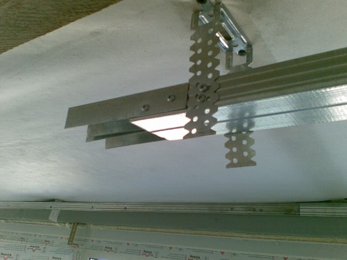 Начинаем монтаж потолочных профилей, длинные из которых нужно задействовать сразу же, установив их от стены до стены. Между ними закрепляем короткие поперечные, крестовые соединения, которые делаются с помощью предназначенных для этого крепежных элементов. Монтируем потолочные профили от стены, для чего вставляем в профиль ПН, который закреплен на стене. Необходимо правильно расположить именно горизонтальный уровень профиля с помощью строительного уровня и прикрепить к подвесу П-образному, причем саморезами металл-металл с обеих сторон. Было бы неплохо использовать уровень с магнитной стороной, он гораздо удобнее.При стыковке профилей лучше всего задействовать специальный соединитель, Не забудьте рассчитать предварительно расположение подвеса П-образного по сторонам от стыка для их укрепления.
