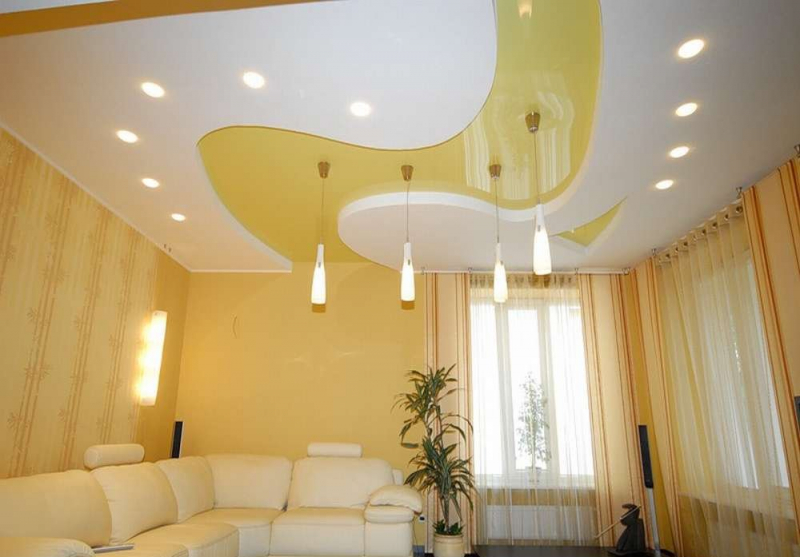 Потолочный короб может иметь любую конфигурацию и размеры, главное, чтобы он органично вписывался в интерьер помещения и выполнял свою основную задачу: скрыть элементы подвеса. Гардины или шторы, опускающиеся прямо из поверхности потолка, смотрятся очень эффектно.