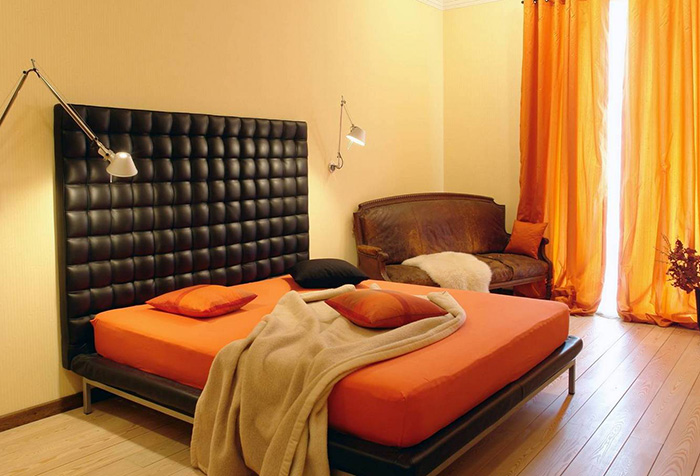 На окна небольшой спальни можно повесить вполне уютные полупрозрачные занавеси светлых оранжевых тонов. Они не будут перегружать интерьер и не «съедят» и без того малую площадь. В просторную комнату подойдут плотные портьеры цвета апельсиновой мякоти в сочетании в белым тюлем. Хорошо, если общий фон спальни будет в светлых тонах: бежевым, голубым или салатным.