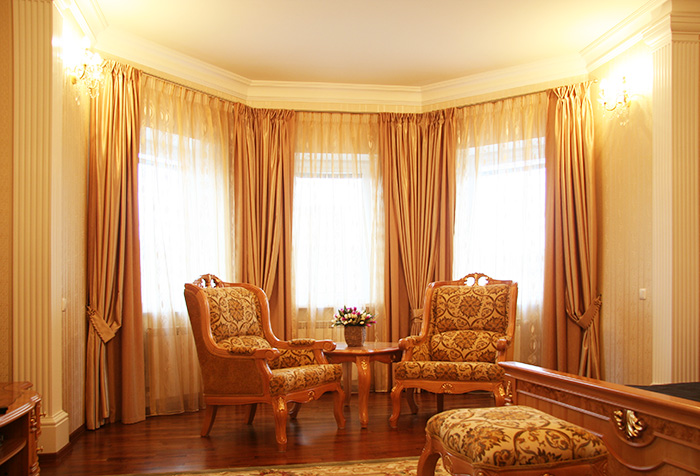 - Длинные светлые портьеры украсят и скорректируют объем небольших помещений. Темные шторы вешайте в большую комнату – пространство сразу станет камернее, уютнее.