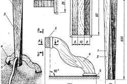 Ножка и разножка круглого журнального столика: а — общий вид ножки; б — размеры разножки; в — размеры ножки; 1 — ножка; 2 — болт для крепления ножки к основанию; 3 —лыска; 4 —разножка; 5 — резино-лрокладка; 6 — выступ для крепления к ножке.