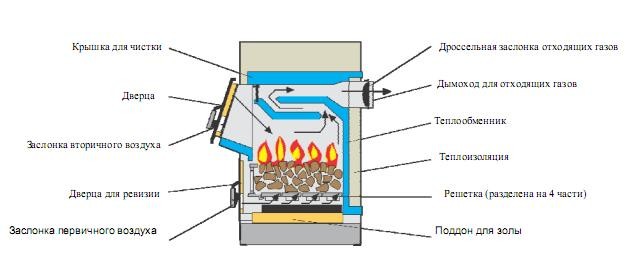 Топка пиролизных котлов, в отличие от обычных печей, делится на 2 части. В первую часть загружается твердое топливо, где оно горит и пиролизуется. Выделяемые при пиролизе древесные газы полностью сгорают во второй части топки, куда подается дополнительный воздух. Эти камеры разделены металлическими колосниками, через которые проходят выделяемые древесные газы.