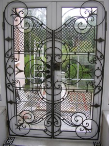 Решетка для основной двери стоит дешевле, нежели «полноценный» решетчатый вариант. Она крепится посредством двух петель и имеет крупный замковый блок. В некоторых решетках применяется изящная художественная ковка.