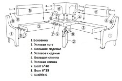 Каждая часть изделия сбивается отдельно. Спинка собирается из длинных планок. Для обеспечения необходимой жесткости планки укрепляются короткими поперечными брусьями. Чтобы получить скошенную спинку, задние планки должны быть длиннее, а передние короче. Сверху полученной рамки устанавливаются листы ДСП, которые затем обклеиваются поролоном и обшиваются тканью.