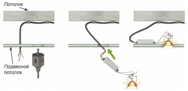 Потолочные поверхности по разработанному плану установки светильников размечаются. Затем производится разводка электропроводов от мест, где будут монтироваться светильники в гипсокартон, до мест их подключения к выключателям. Проводка, размещенная во внутренней части гипсокартонного потолка, должна быть проложена в специальной гофрированной трубке, изготовленной из негорючей пластмассы.