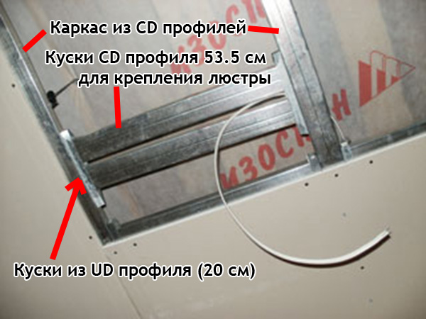 Лучшим вариантом крепления люстры будет заранее установленный профиль, на котором ее можно закрепить обычными саморезами.