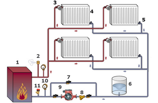 Двухтрубная закрытая система отопления: 1 – котел, 2 – автовоздушник, 3 – термостатический клапан, 4 – радиатор отопления, 5 – балансировочный клапан, 6 – бак для компенсации теплового расширения теплоносителя, 7 – шаровой кран, 8 – фильтр сетчатый магистральный для грубой очистки теплоносителя, 9 – циркуляционный насос, 10 – термоманометр для измерения давления и температуры, 11 – предохранительный клапан.