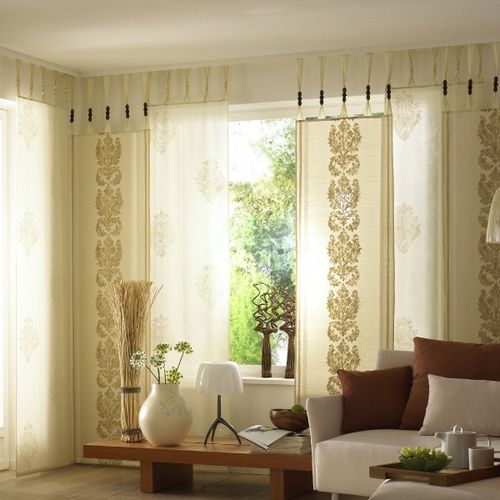 Дизайнеры часто сочетают раздвижные шторы для больших окон и римские для узких. Эффектны будут в гостиной раздвижные портьеры на одной стороне и наличие ламбрекена с другой, особенно если они гармонируют с мягкой мебелью.