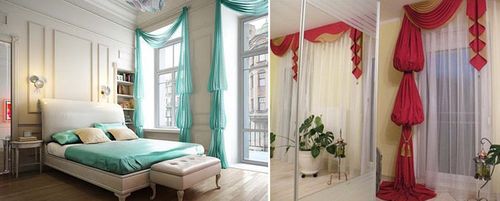 Итальянские занавеси состоят из двух полотен, которые поверху рамы плотно соединяются друг с другом, а немного отступив от края, подвязываются по диагонали от центра к верхним углам. Для такой модели подойдут узкие шторы, так как полотна не планируется сдвигать, или раздвигать. Итальянская портьера образует над рамой своеобразную арку, которая в верхней части имеет форму, напоминающую треугольник или остроконечный купол. Изменение геометрии позволяет абстрагироваться от конфигурации рамы.
