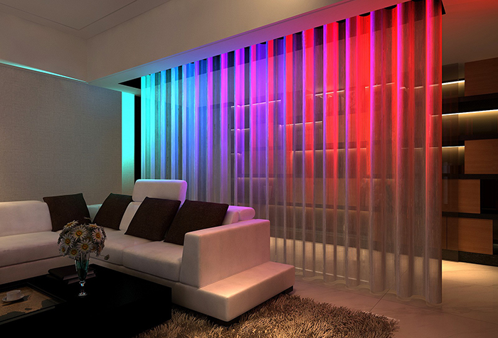 Один из способов оригинально украсить шторы для разделения комнаты на зоны – сделать диодную подсветку. При этом рекомендуется продумать общий светодизайн – это один из лучших способов визуального зонирования пространства. Очень красиво, когда свет от диодов с потолка струится по капроновой вуали. Когда есть возможность приобрести карнизы с подсветкой – стоит ею воспользоваться.