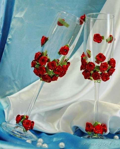Обычные бокалы тоже можно сделать креативными и яркими. Для молодоженов красиво украшенные фужеры могут стать семейной реликвией и памятью о торжестве. Бокалы принято разбивать на свадьбе, поэтому лучше купить 2 комплекта.