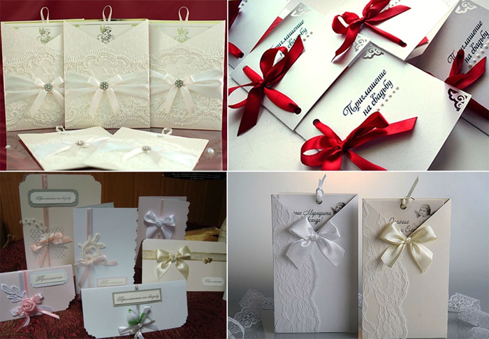 Распечатайте текст на красивой бумаге и вклейте в заготовки из картона. Наружную же сторону можно украсить кружевом и красивыми завязками из атласных лент. Это лишь один из вариантов. Каким будет ваше уникальное приглашение, зависит только от вашей фантазии и желания. Можно творчески подойти и к составлению текста самого приглашения, а не просто написать дату и время бракосочетания.