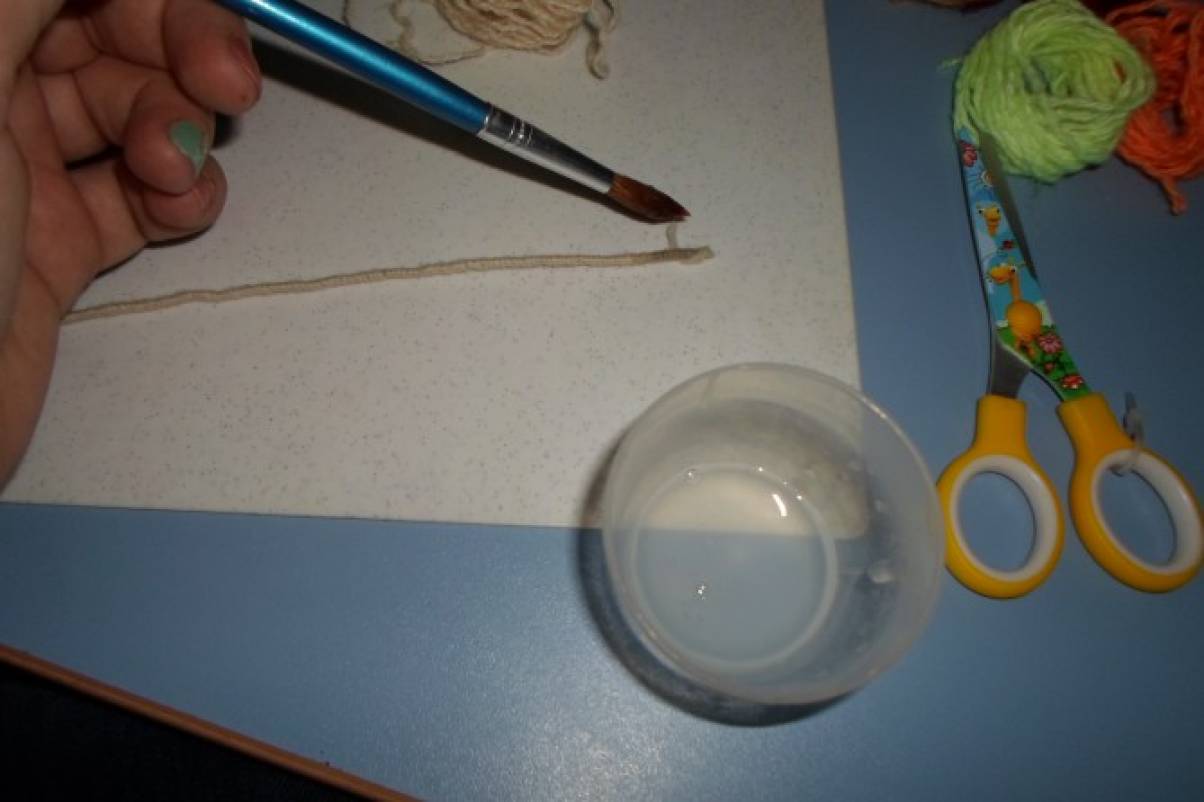 - На него накладываются мелко порезанные нитки и равномерно распределяются. Для лучшего приклеивания можно слегка надавить на отрезки рукой или поместить поделку под небольшой пресс (книга, деревянная доска).
