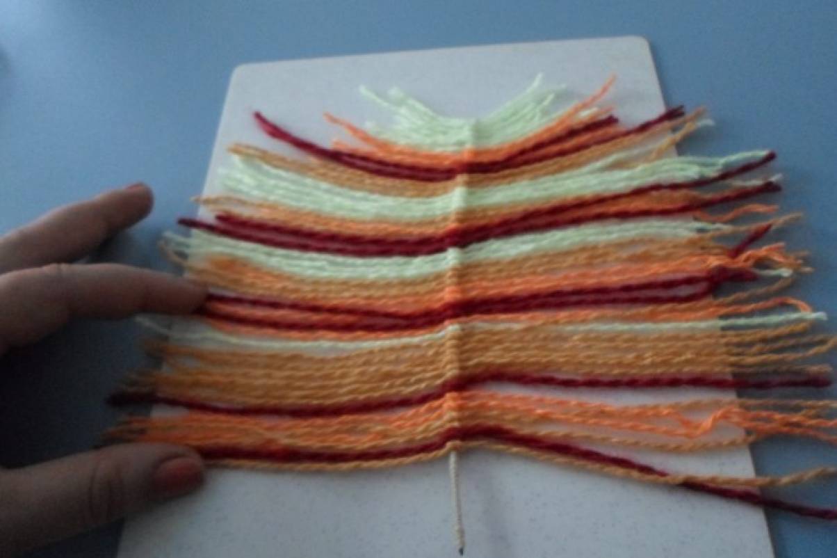 Процесс наматывания очень увлекательный. Можно использовать разноцветные нити. Для осенней картины подойдут такие цвета как красный, оранжевый, бордовый, зеленый и желтый.