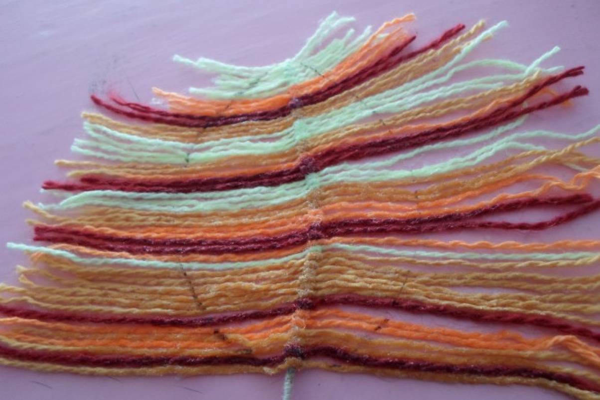 - После этого берётся оранжевая, жёлтая, красная пряжа и нарезаются небольшими кусочками.