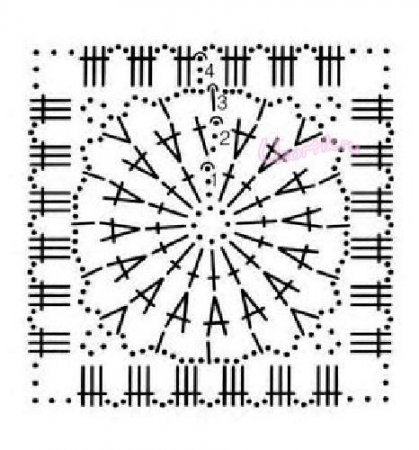 Размер по объему — 83 сантиметра. Этот вариант вяжется 112 мотивами «квадрат» по схеме, показанной на фото: