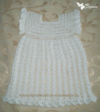 Такое нежное белоснежное платье на девочку подойдет для наряда на праздник для детей. Вязать такое платьице следует из натуральной хлопковой пряжи. Размер платья — 68 см, длина — 44 см.