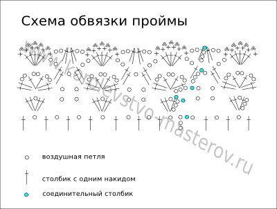 Наберите 105 возд. п. + 3 возд. п. подъема, вяжите узором по схеме 1. Затем разделите работу следующим образом: по 6 раппортов на каждый рукав, 6 раппортов на спинку и 7 раппортов на перед. Провяжите 1 ряд ст. б/н, выполнив дополнительно по 3 возд. п. для пройм с каждой стороны.