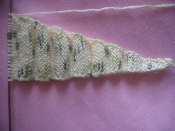 Первая часть: набираем на спицы 3 петлицы, вяжем 6 рядочков 6 петлиц лицевой гладью, теперь прибавляем 1 петлицу в окончании каждого 6 рядочка – с внутренней стороны изделия.