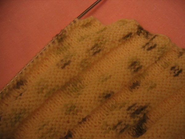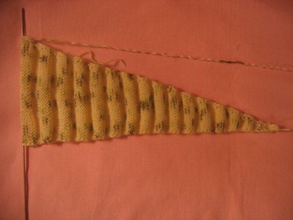 На втором этапе вязание меняет направление на поперечное. Прибавления по одной петлице делают по окончанию каждого второго ряда (по внутренней стороне), в тоже время закрывая одну по началу каждого из шести рядов (по внешней стороне).