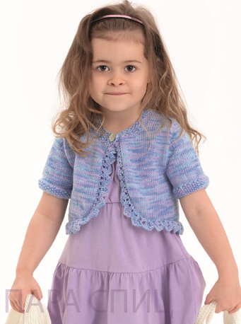 Маленькое летнее вязаное болеро для девочки со спущенным рукавчиком и оборкой по нижнему краю, выполнено спицами сверху вниз одним полотном. Простая, но стильная модель станет хорошим дополнением к нарядному платью.
