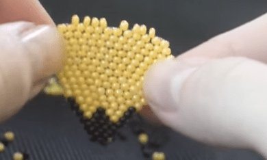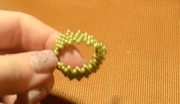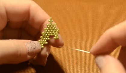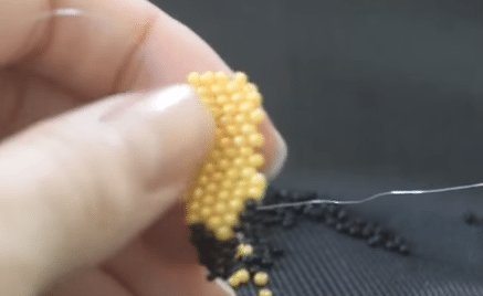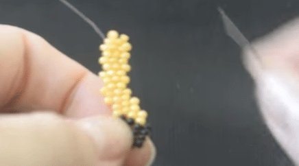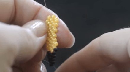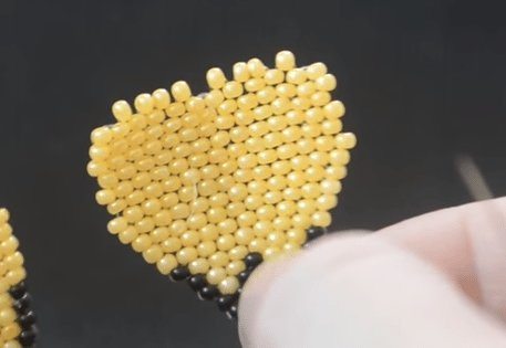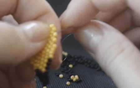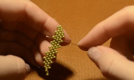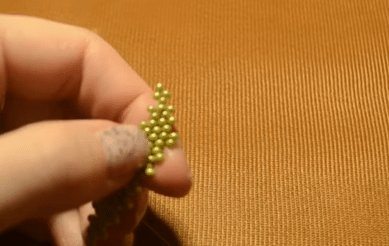 - Остальные ряды делаются таким же образом. Этот способ бисероплетения называется параллельным. Для создания четвёртого и пятого рядов вам нужно будет набрать по 4 бусины. Для шестого — три, седьмого — две. Для восьмого будет достаточно только одной бисеринки.