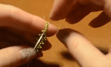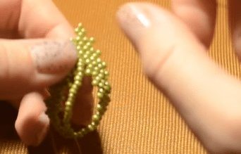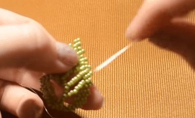 В конце нанизываем четыре бисеринки и заводим иголочку в четвертый фрагмент, тщательно подтягивая леску.