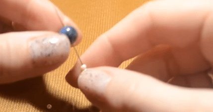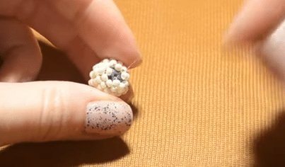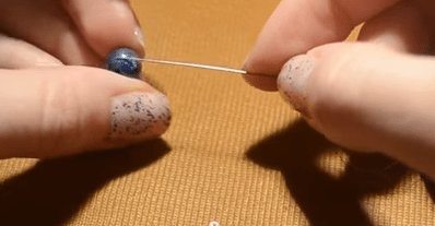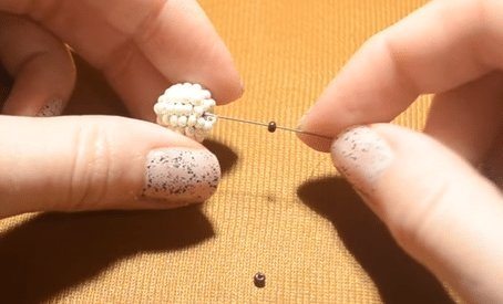 После всех проделанных шагов, берем трижды по одной бисеринке и заводим иголку по очереди в каждый торчащий компонент, направляясь вниз.