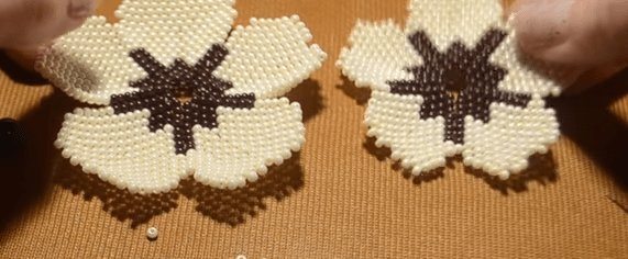 Теперь нам нужно сплести ещё пять лепестков, но меньшего размера. Они плетутся аналогично крупным, но по краям должно быть только по одной розовой бисеринке, а самая широкая часть лепестка (средний ряд) состоять из трёх белых. В итоге у вас получатся заготовки, как на фото выше.