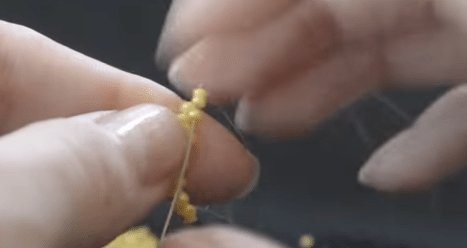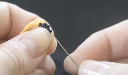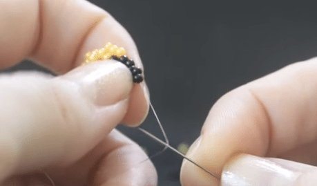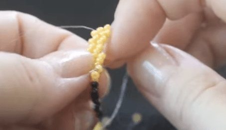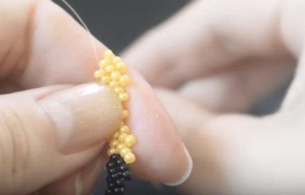 - Свободный конец проволоки протягивается через 2, 3 и 4 бисеринки, а затем в жёлтую — самую первую.