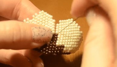 - Такое плетение продолжается до среднего ряда, в котором будет пять белых бусин. Остальные ряды выполняются также, но белые бисерины теперь не прибавляются, а убавляются на одну.