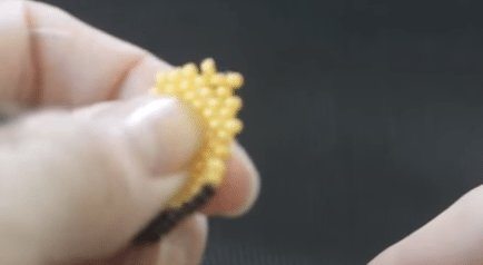 - Конец проволоки скручивается под жёлтой бусинкой. Первый цветочек готов!