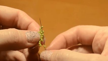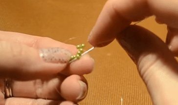 Берем три зеленые бусинки, опускаем их к работе.