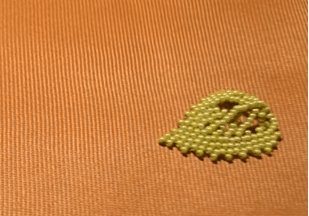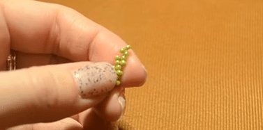 - Чтобы сделать чашечку наберите на кусок проволоки много бисеринок зелёного цвета, и скрутите из них несколько петелек длиною около 1,5 сантиметра.