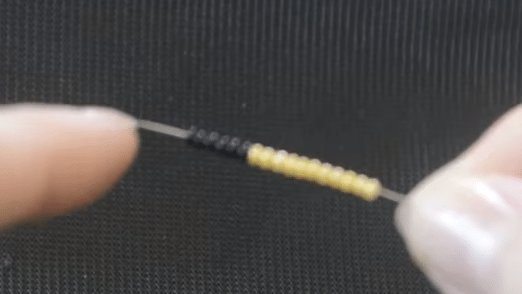 - Для начала требуется набрать на проволоку шесть бисеринок. Первая из них — жёлтого цвета, остальные пять — синего.